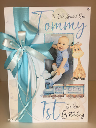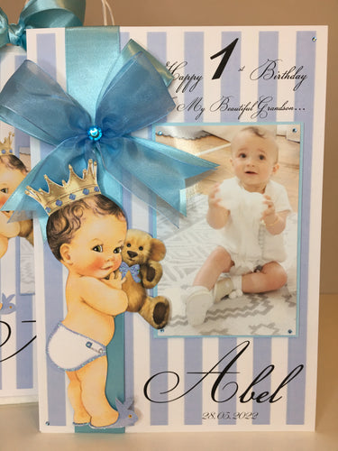 Blue/White Stripe Prince with Bear Pop Up Luxury Photo Card